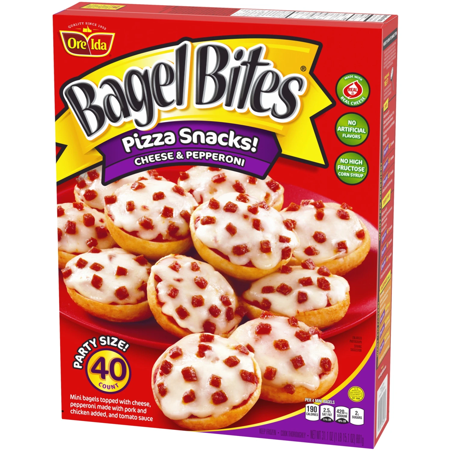 Bagel Bites Cheese & Pepperoni Pizza Snacks offer a quick and easy snack that kids love and parents can easily serve. Our mini pizza bagels are topped with cheese, pepperoni made with pork and chicken…