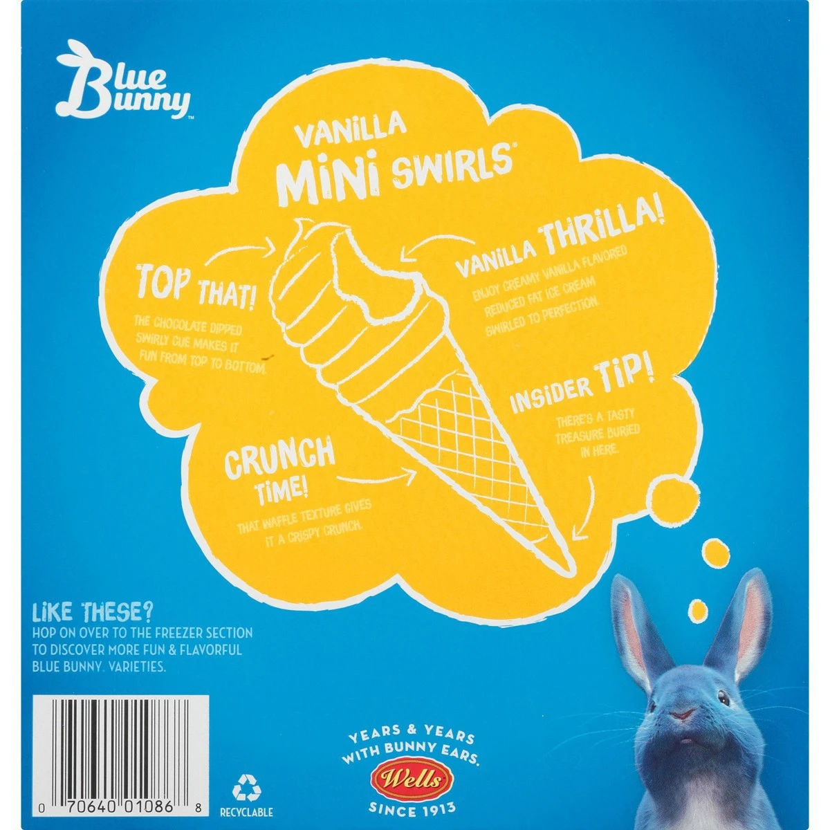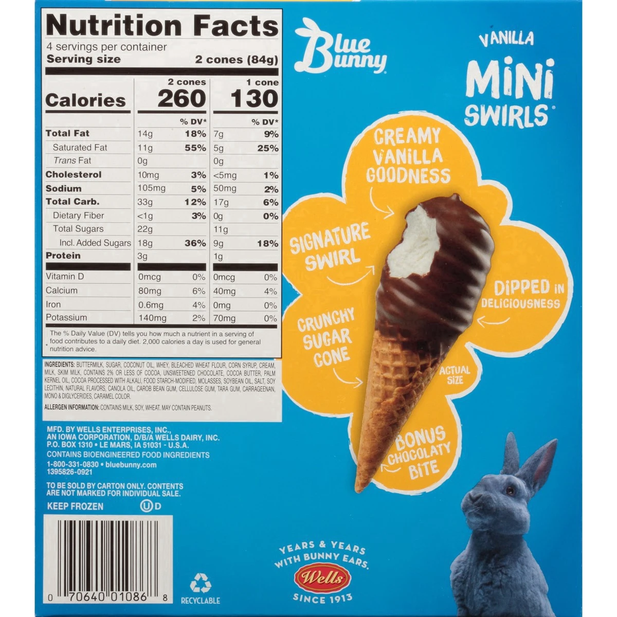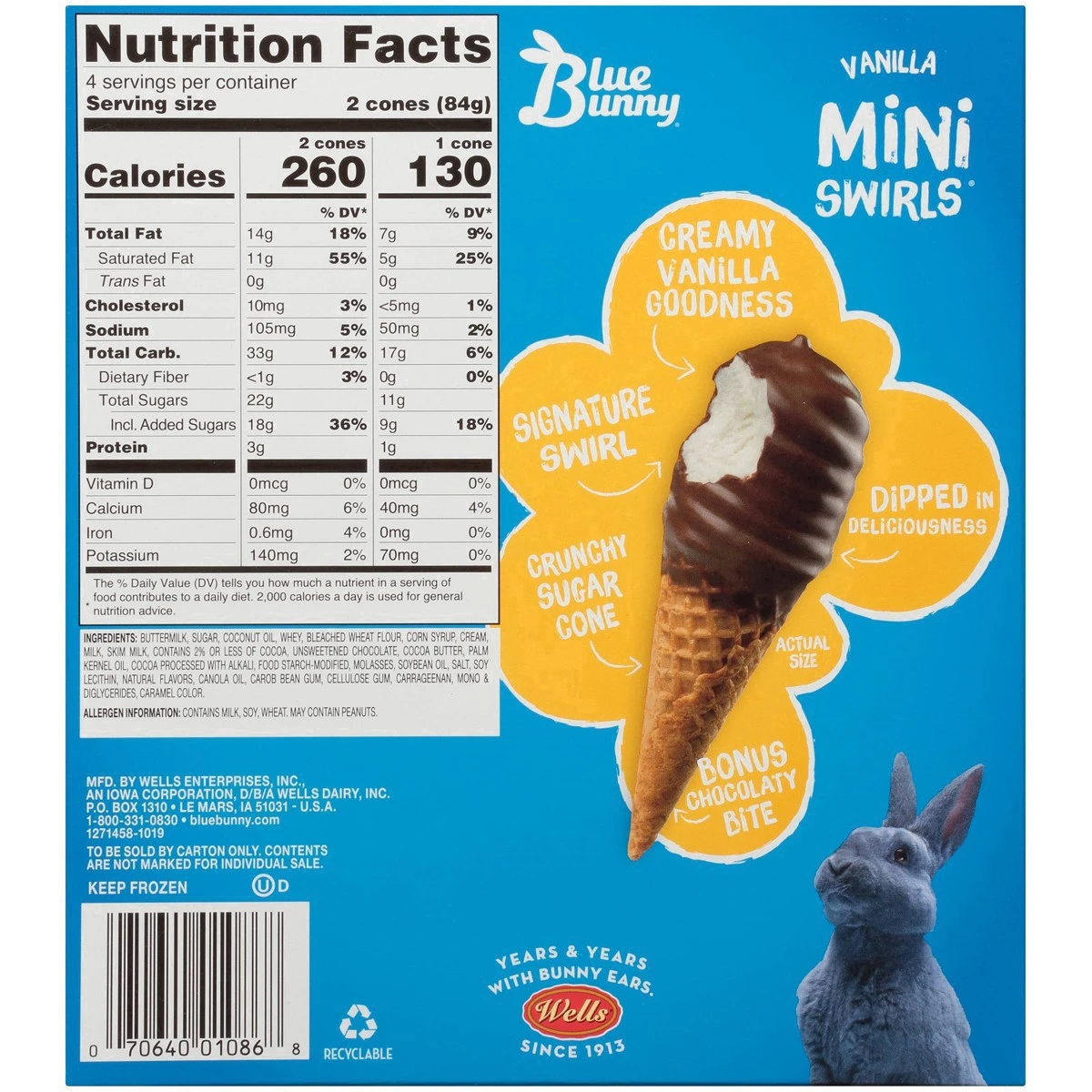 Blue Bunny Mini Swirls are a tasty treat that’s no biggie! Vanilla flavored frozen dairy dessert dipped in chocolate flavored coating all inside a sugary cone. You can’t go wrong with this classic. Th…