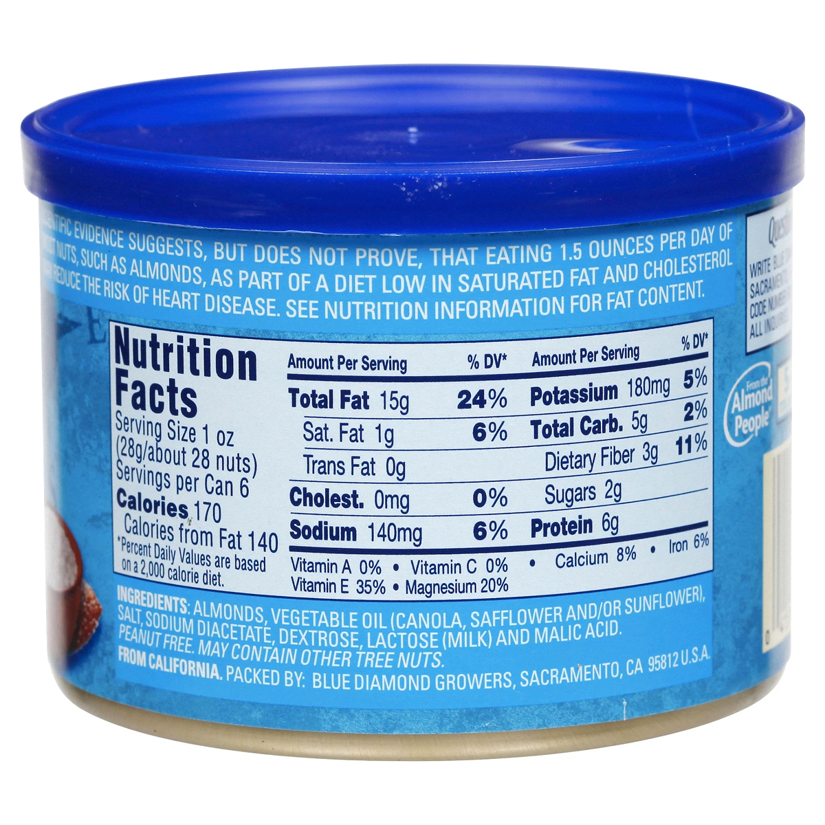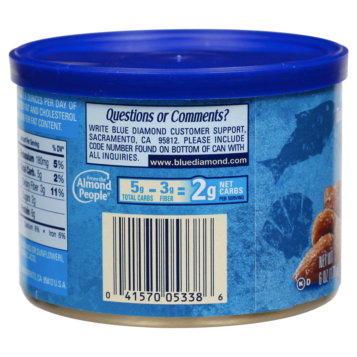 Intense taste! Smart snacking! Artificially flavored. Questions or Comments? Write Blue Diamond Customer Support, Sacramento, CA 95812. Please include code number found on bottom of can with all inqui…