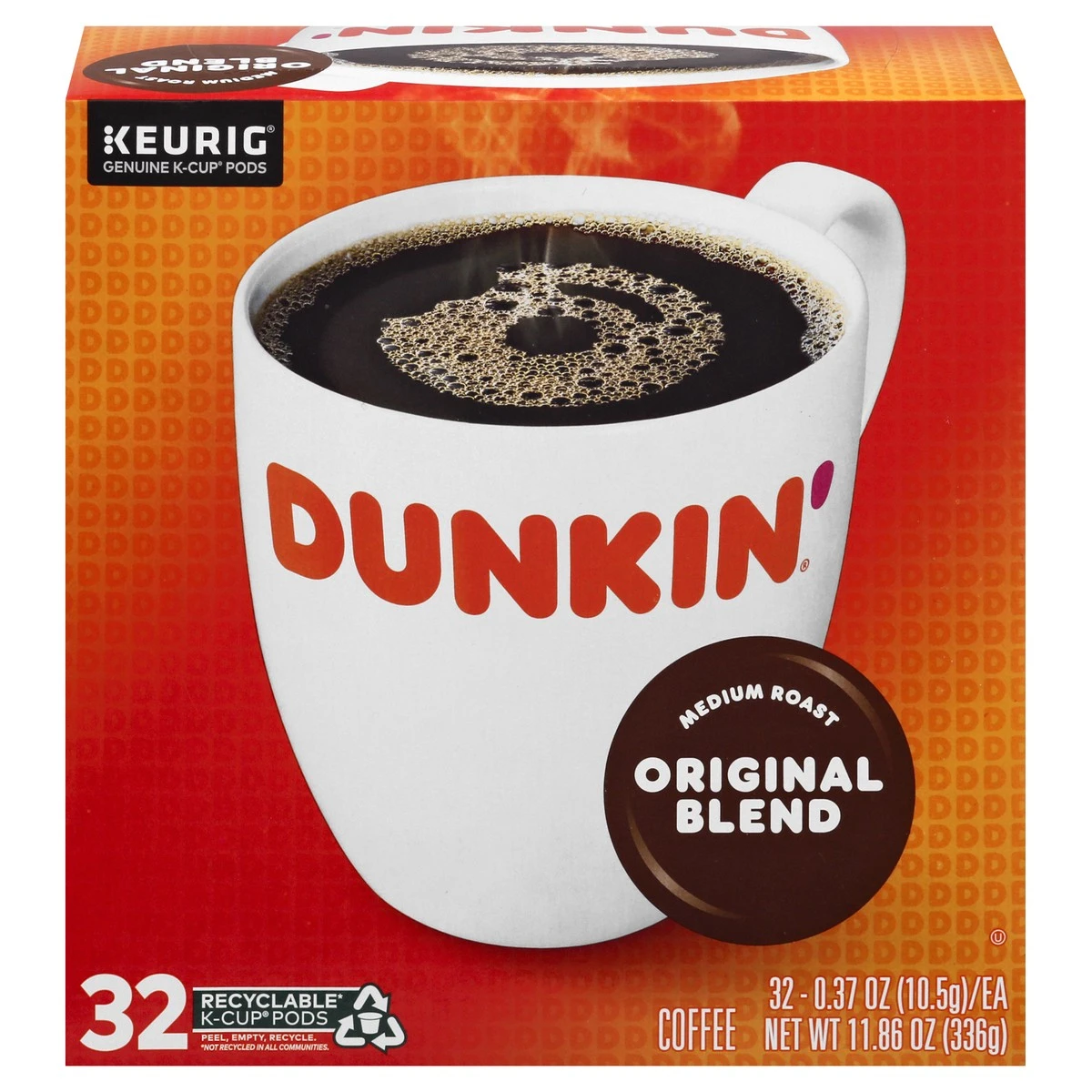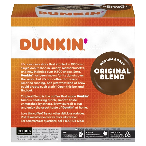 32 recyclable (not recycled in all communities) K-Cup pods. Genuine K-Cup pods. It’s a success story that started in 1950 as a single donut shop in Quincy, Massachusetts, and now includes over 9,500 s…
