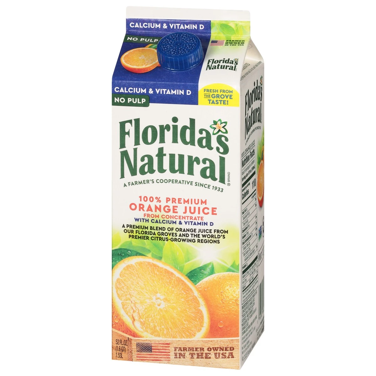 100% premium Florida orange juice. Made from 100% Florida oranges. Pasteurized. Not from concentrate. 100% orange juice. Non GMO. Non GMO Project verified. nongmoproject.org. With us, it’s personal. T…
