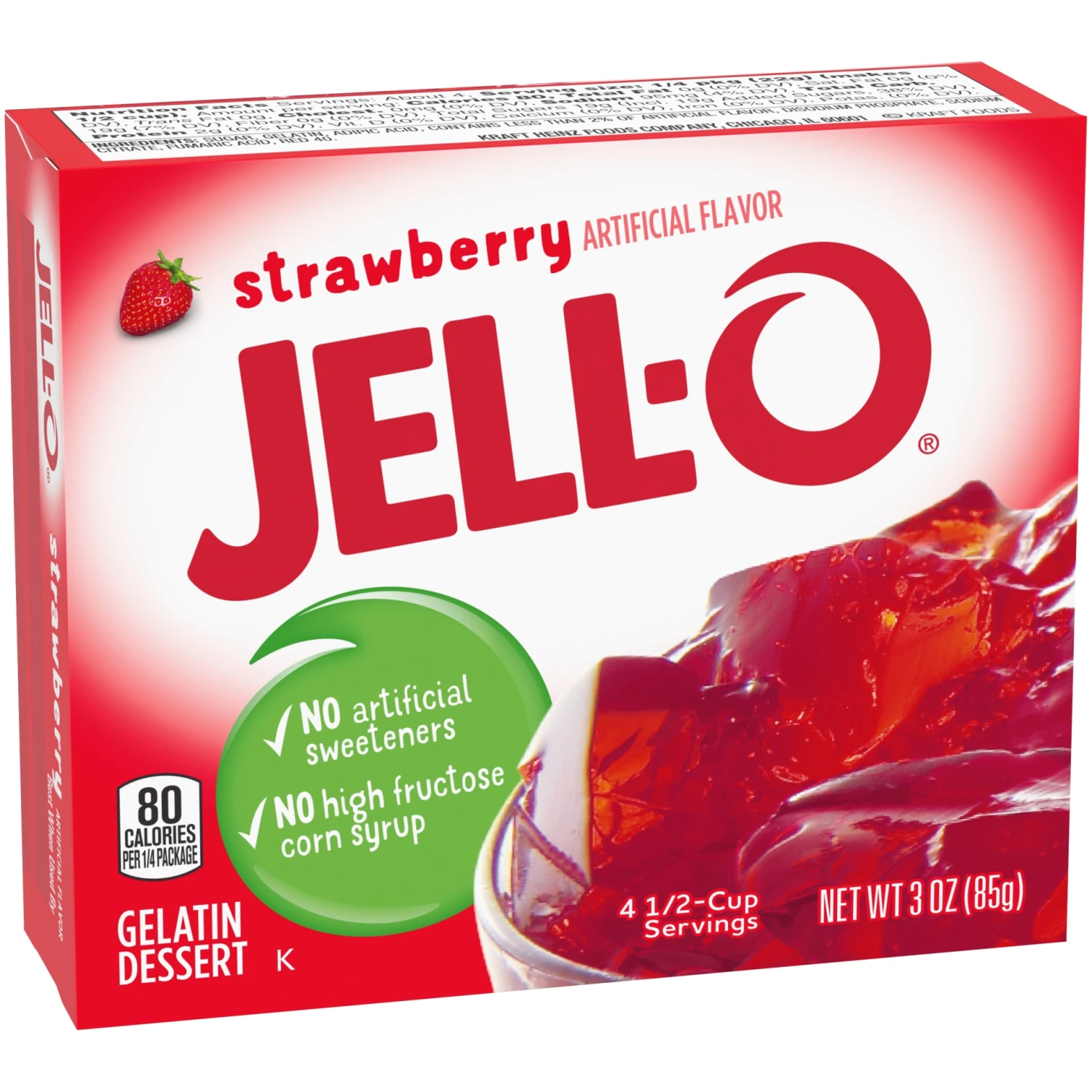 Snack happy. Jell-O Strawberry Artificially Flavored Gelatin Dessert Mix lets you add some wonder to your day with a delicious snack. Spoon up a smile with our artificially flavored strawberry Jell-O …