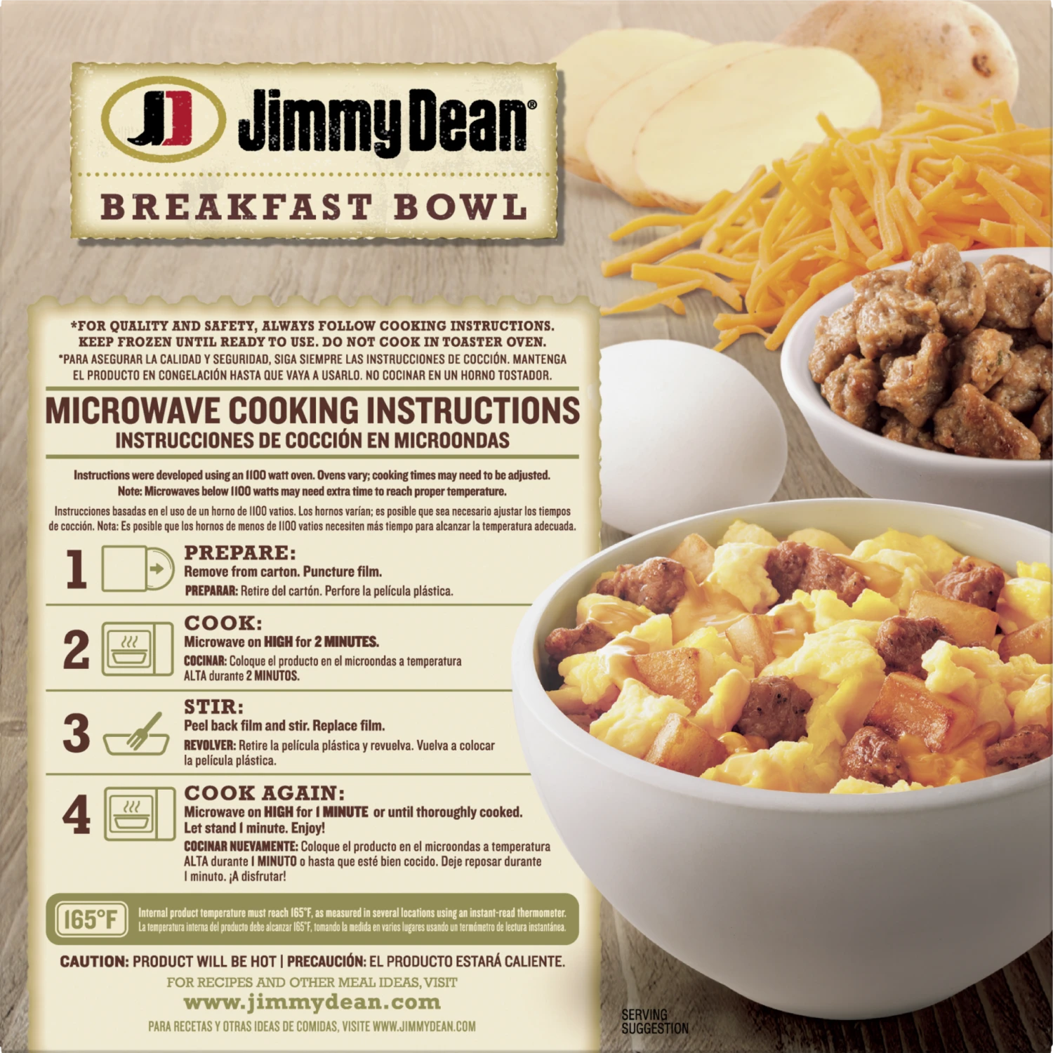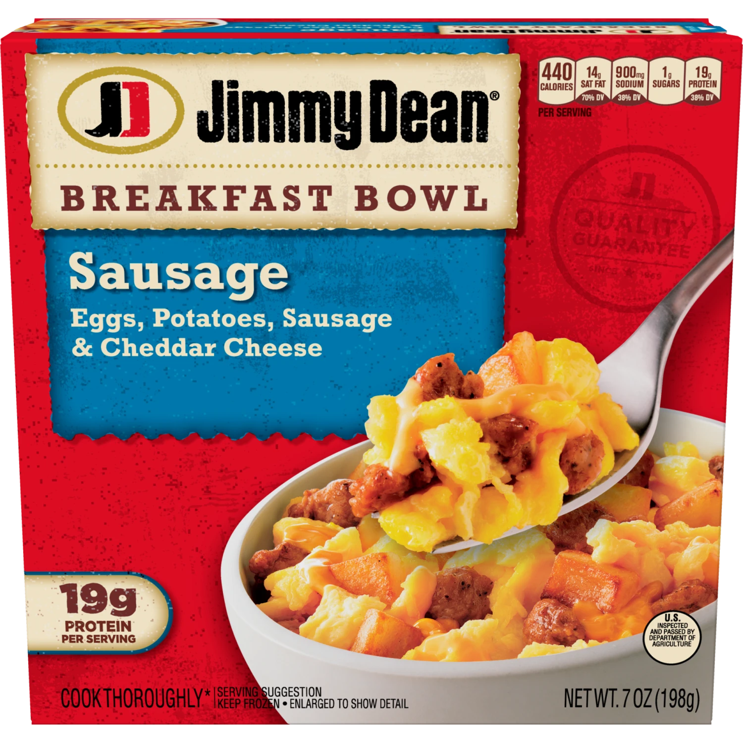 Filled with sausage crumbles, eggs, potatoes, and cheddar cheese, Jimmy Dean Sausage, Egg & Cheese Breakfast Bowls are sure to be the best part of your morning. Each microwavable bowl has 19 grams of …