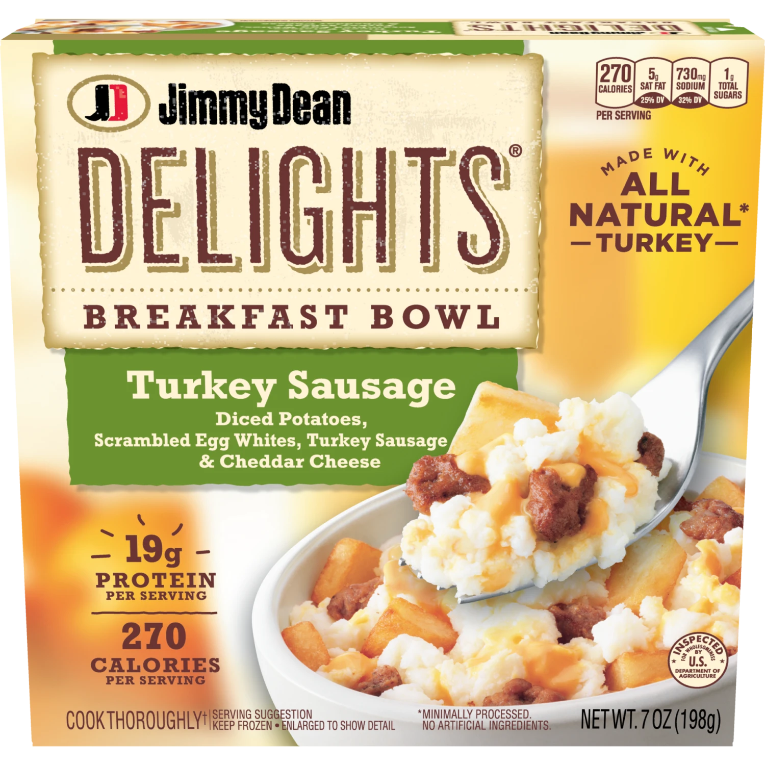 Jimmy Dean Delights Turkey Sausage Breakfast Bowl has all of your breakfast favorites. This microwavable breakfast is filled with turkey sausage, eggs, diced potatoes and cheese. With 18 grams of prot…