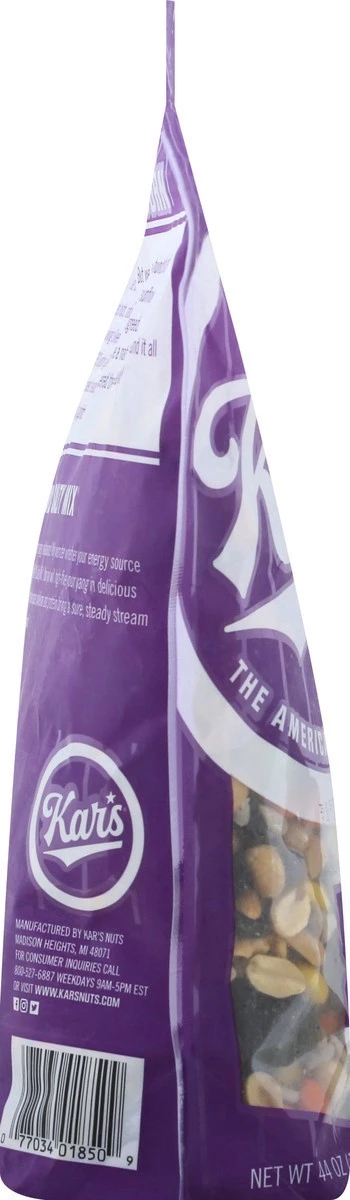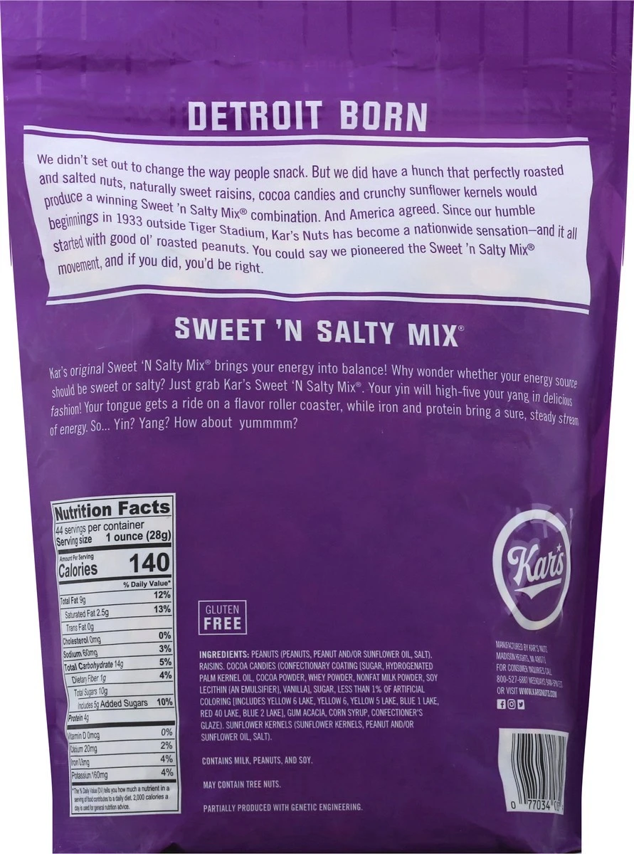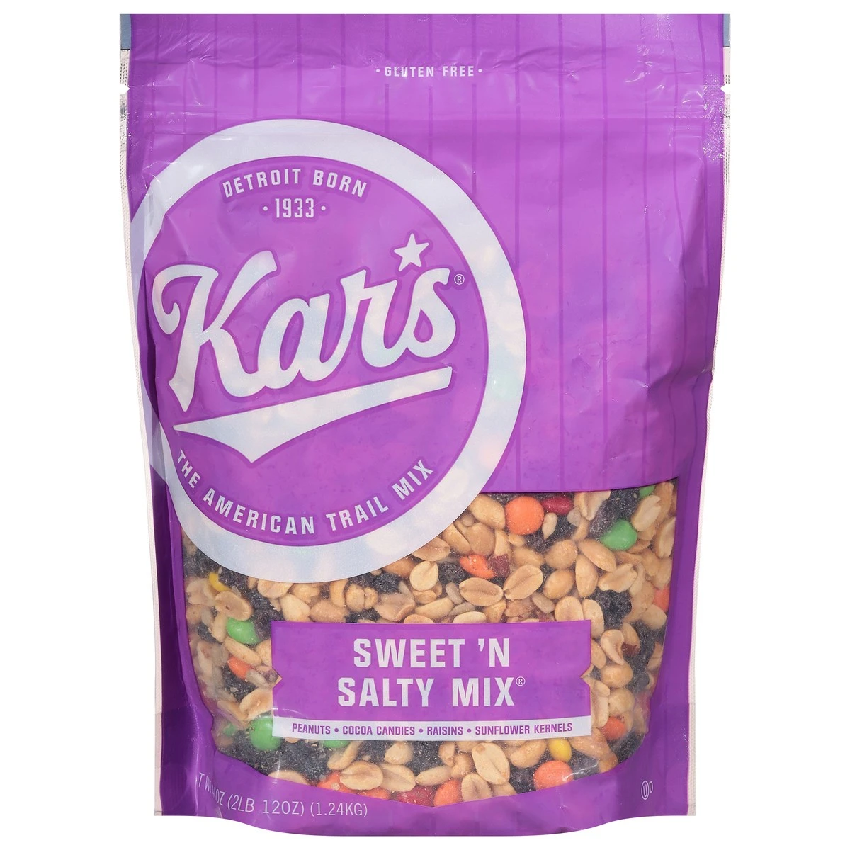 A gluten free, flavorful mix of salted peanuts, chocolate candies, raisins and sunflower kernels.
