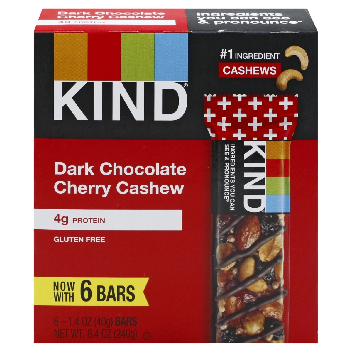 KIND Dark Chocolate Cherry Cashew bars are satisfying gluten free bars packed with nuts and the taste of dark chocolate that you can take anywhere. These KIND nut bars lead with cashews as the #1 ingr…