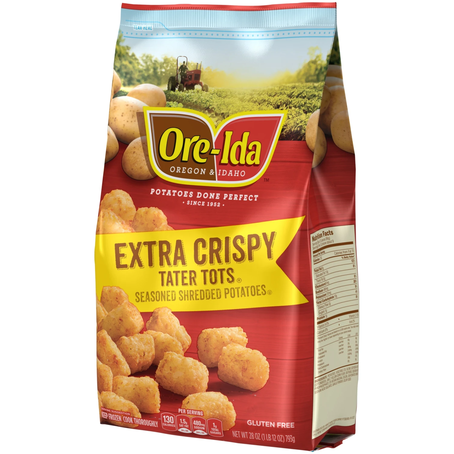 Ore-Ida Extra Crispy TATER TOTS make it easy to enjoy delicious seasoned potatoes at home. Crispy and golden, these Grade A TATER TOTS are made from freshly peeled, American grown potatoes. These glutâŚ