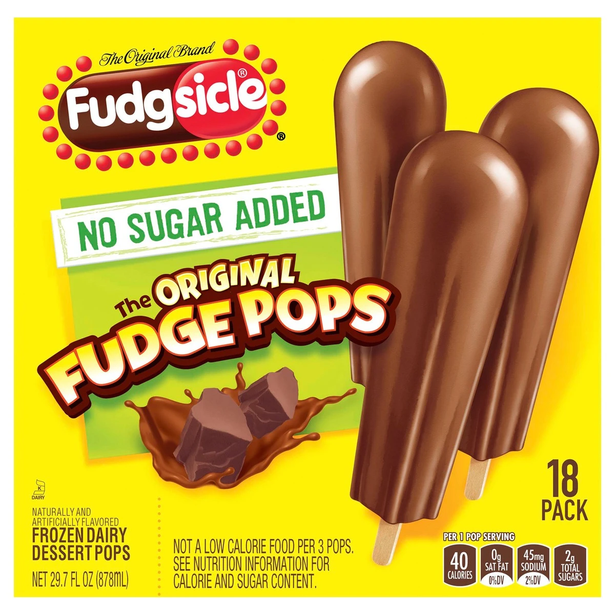 Fudgsicle No Sugar Added Fudge Pops have the original, delicious chocolate-flavored taste you love, now with no added sugar and only 40 calories per pop! These frozen ice pops can be enjoyed guilt-fre…