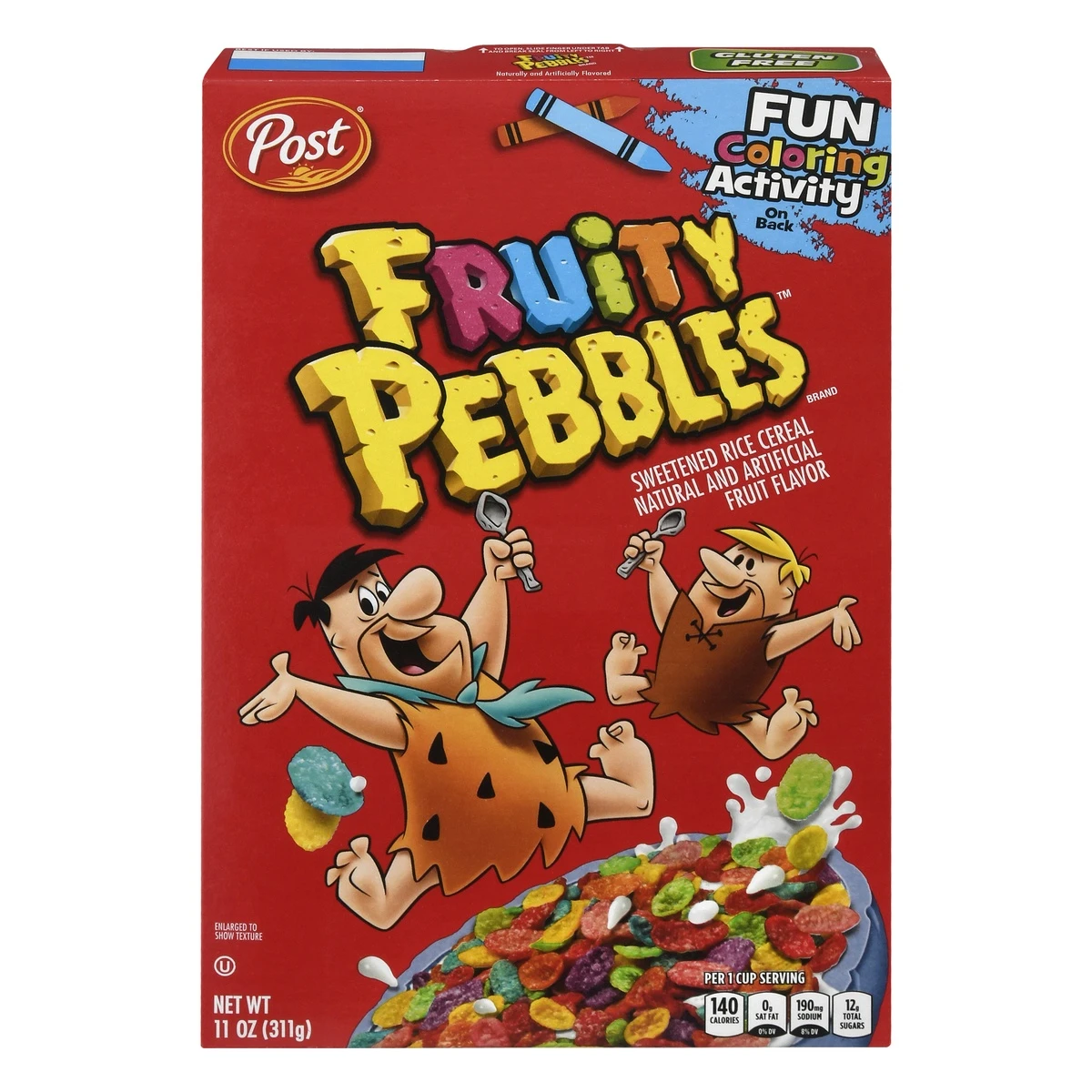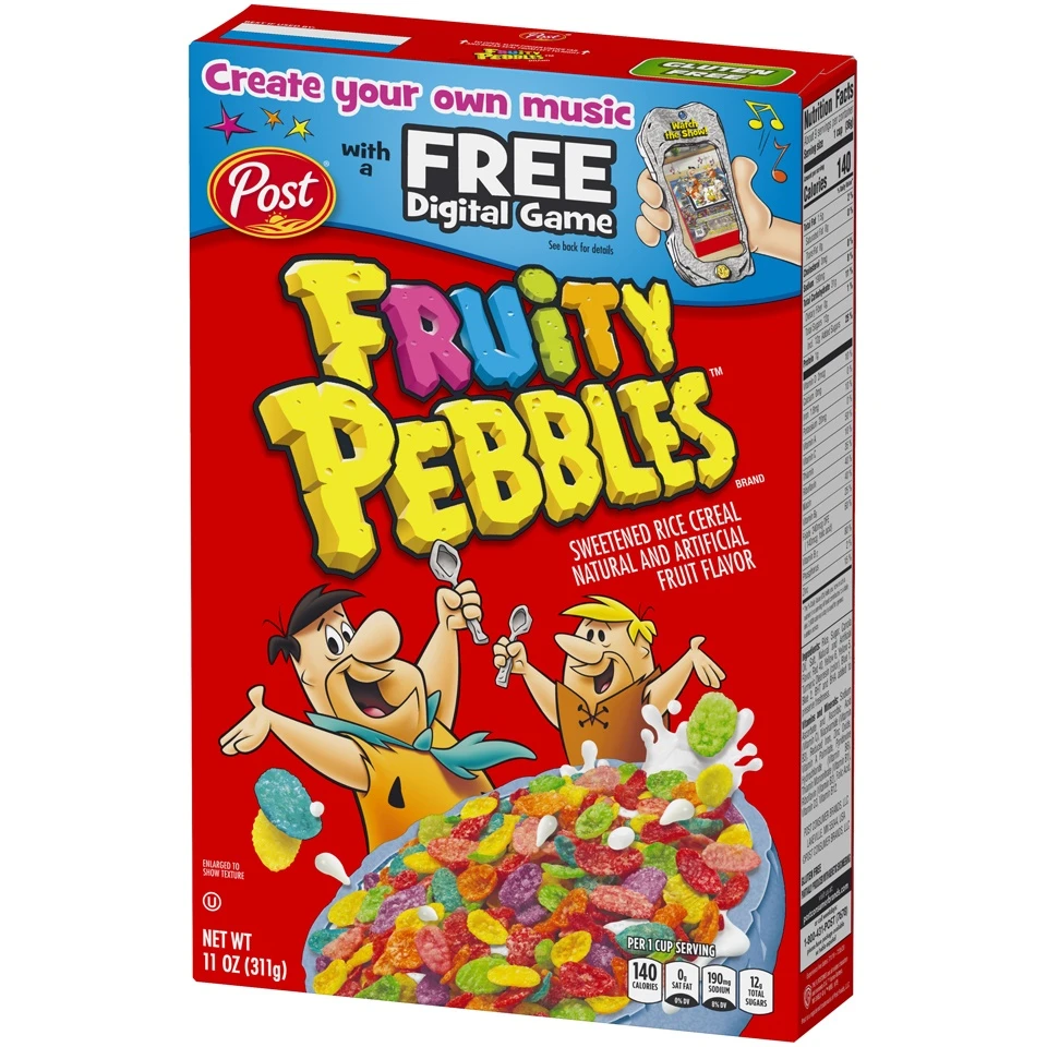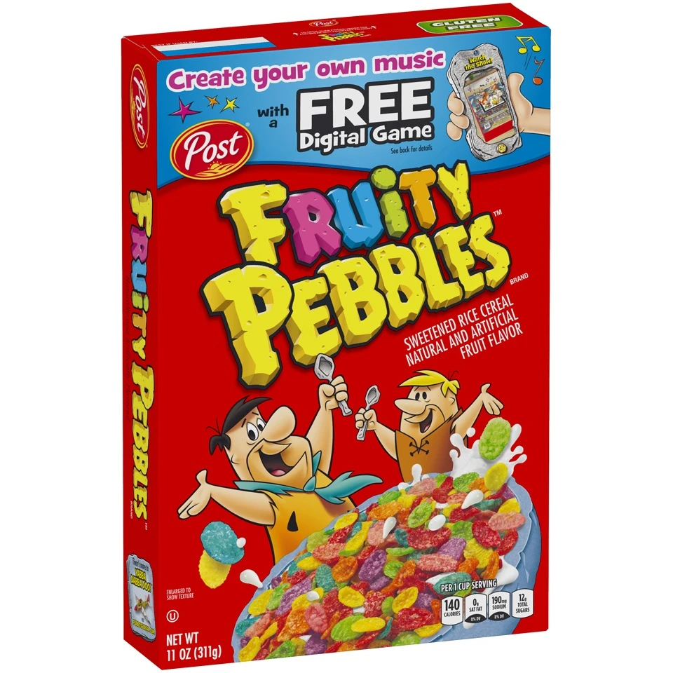 Celebrate creativity and enjoy fruity Yabba Dabba Doo deliciousness with every bowl of Post Fruity PEBBLES Kids Cereal. These colorful gluten free cereal pieces spark joy at breakfast time for kids an…