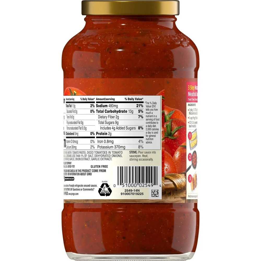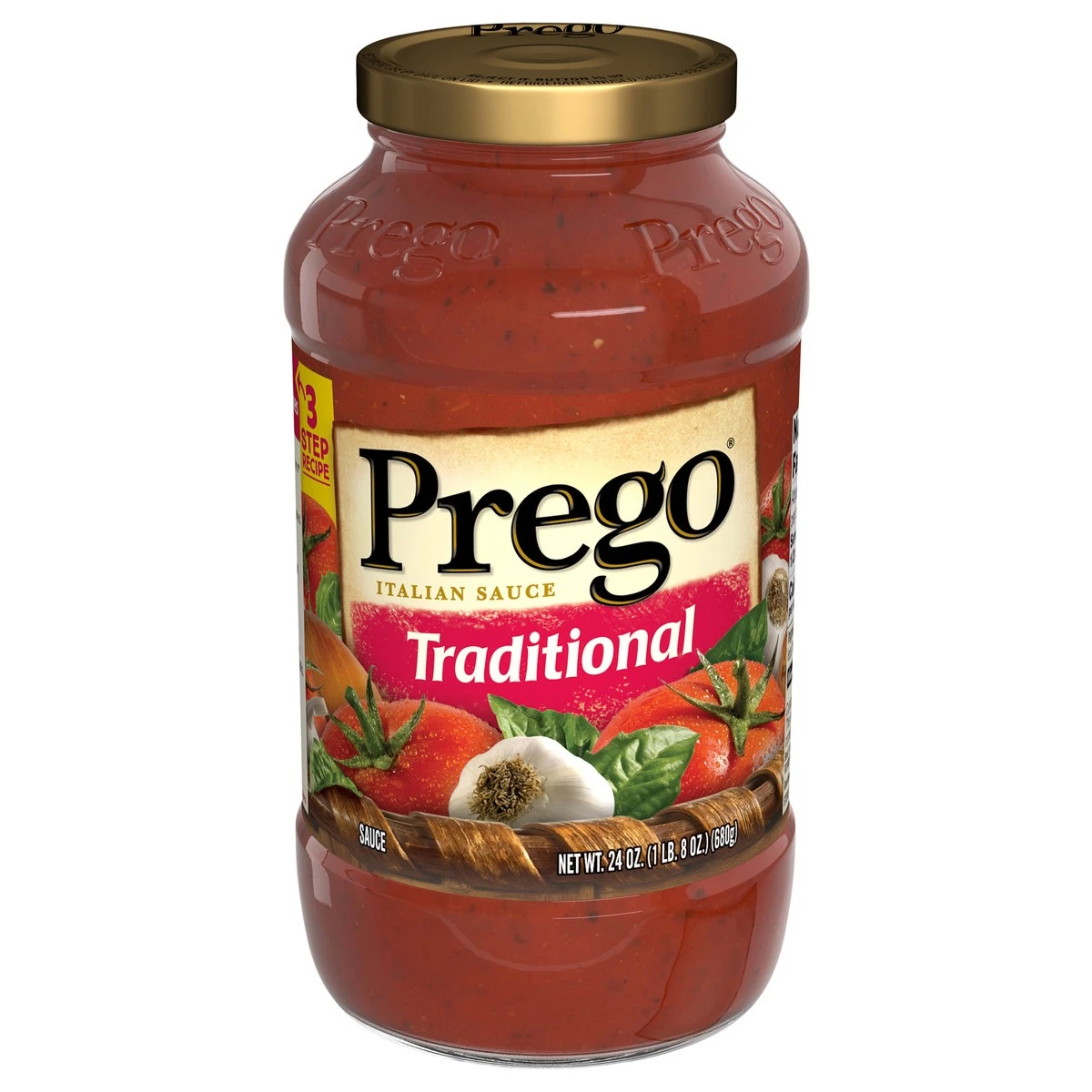 Prego Traditional Pasta Sauce features the rich, sweet flavor of vine-ripened tomatoes balanced with savory herbs and seasonings. Simply pour over pasta or use this classic to transform pantry ingredi…