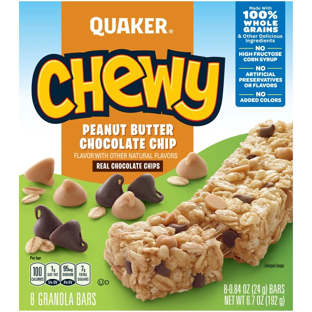 Quaker Chewy Peanut Butter Chocolate Chip Granola Bars contain 8 grams of whole grain and have no high-fructose corn syrup, making these granola bars a tasty treat. The chewy granola and crunchy peanu…