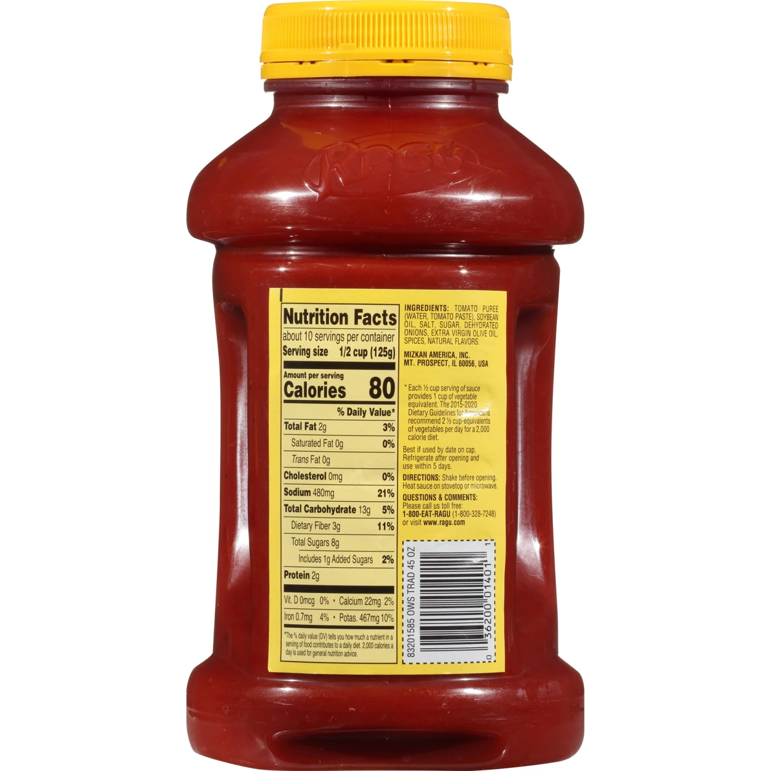 No artificial flavors. Per 1/2 Cup: 60 calories; 0 g sat fat (0% DV); 480 mg sodium (21% DV); 8 g sugars. 2 servings of veggies per 1/2 cup (Each 1/2 cup serving of sauce provides 1 cup of vegetable e…
