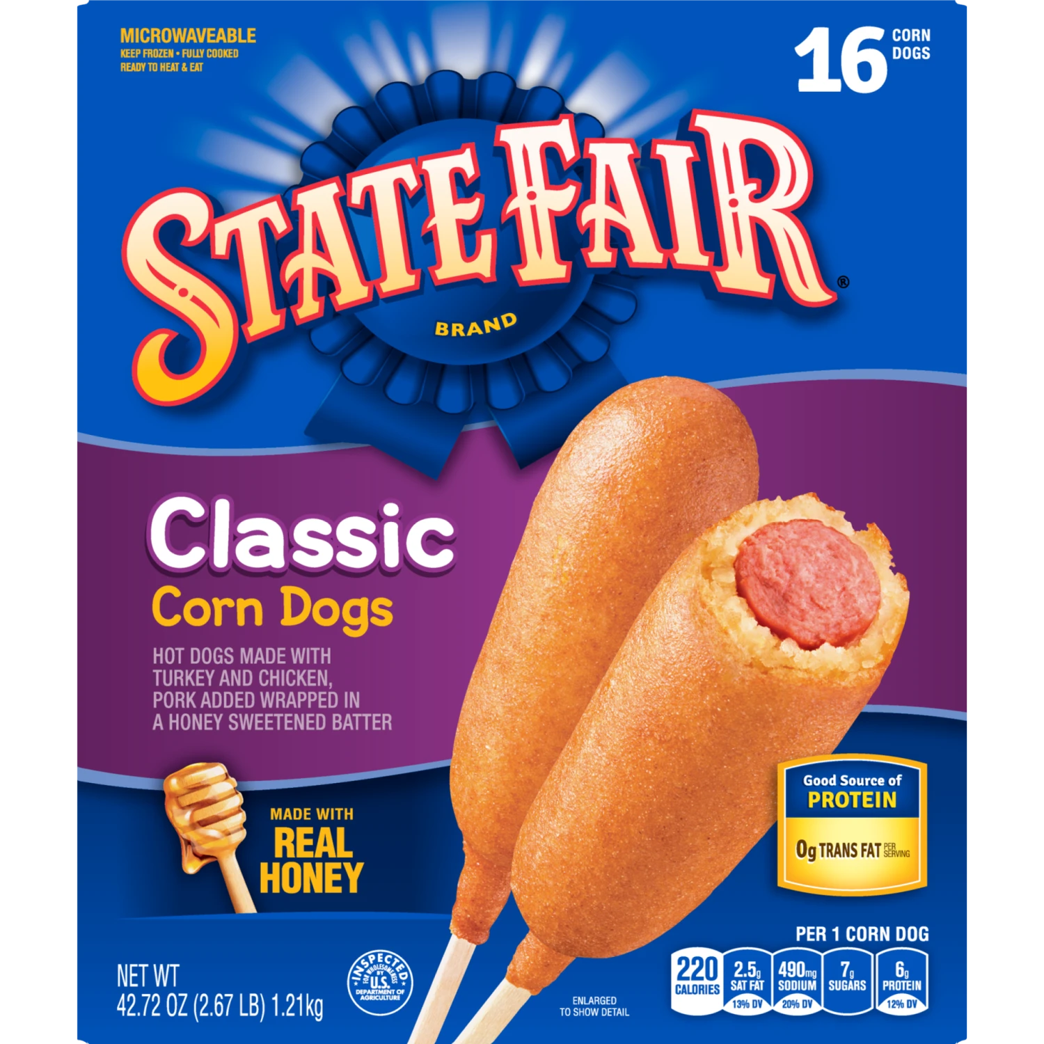 State Fair Classic Corn Dogs are made with classic hot dogs that are wrapped in a honey sweetened batter for a heat and serve frozen food that moms will love, too. With 6 grams of protein and 0 grams …