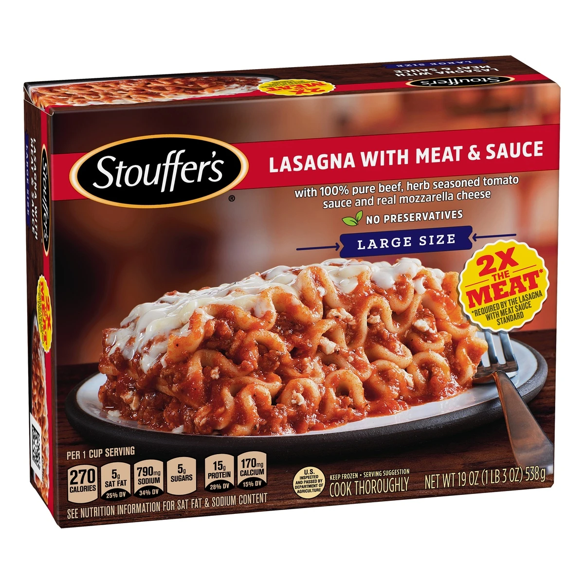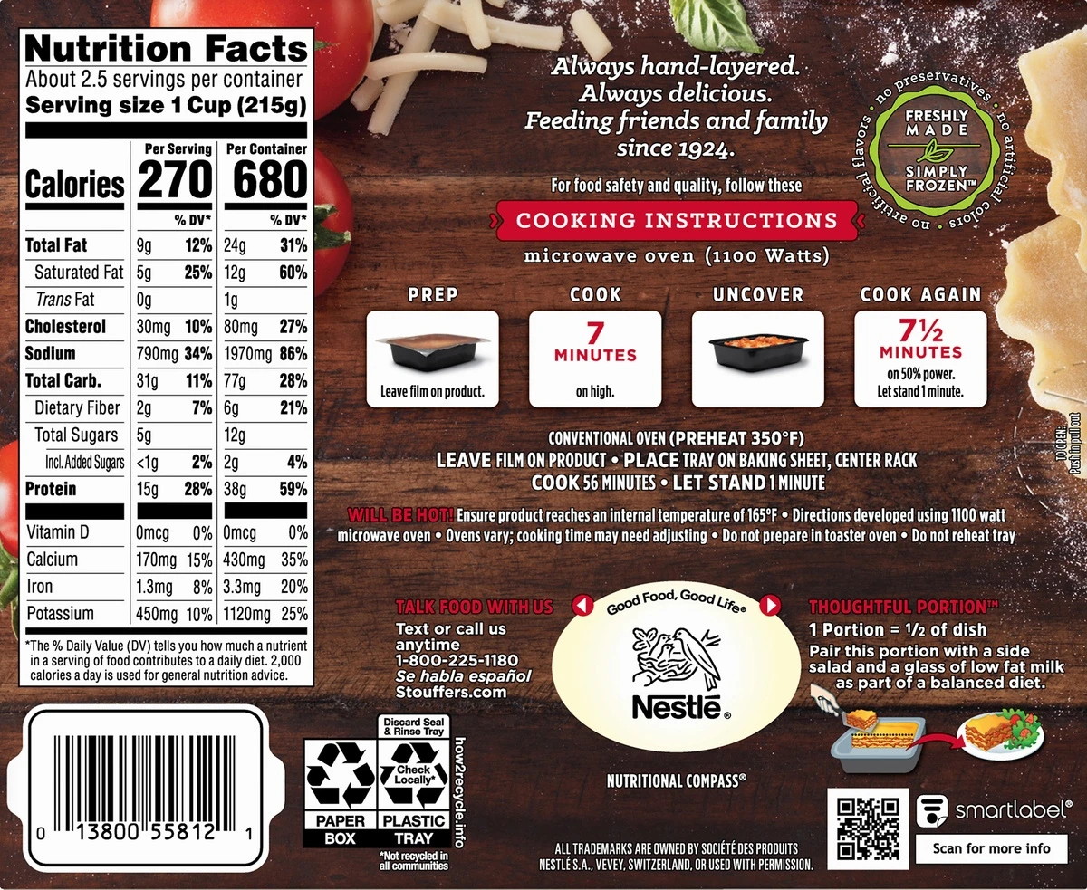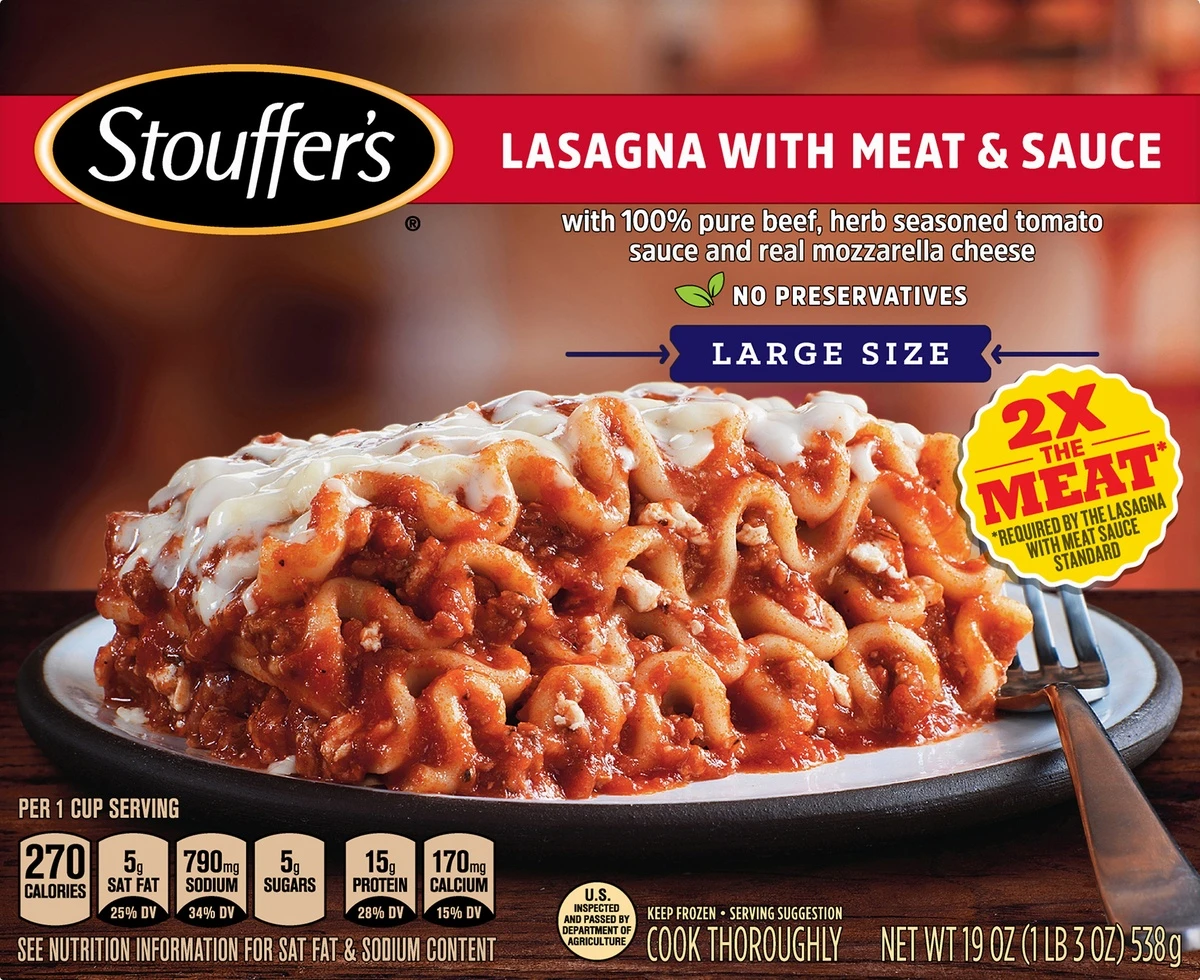 Stouffer’s Lasagna with Meat & Sauce Frozen Meal offers a quick, easy solution for lunch or dinner. This frozen lasagna dinner includes 100% pure beef, herb seasoned tomato sauce and real mozzarella c…