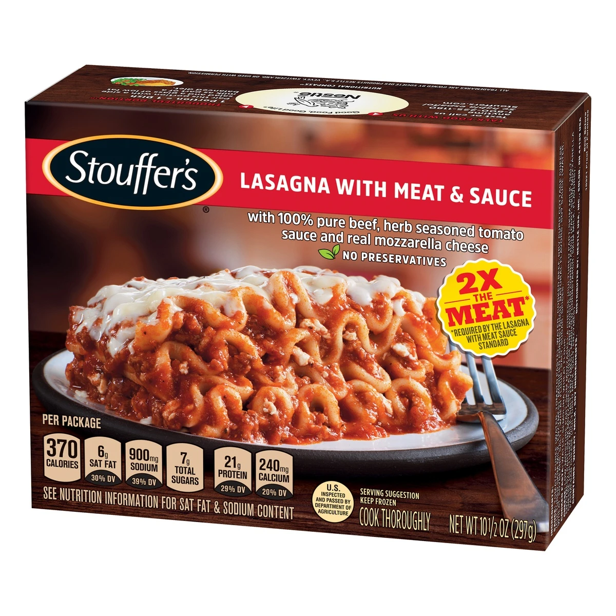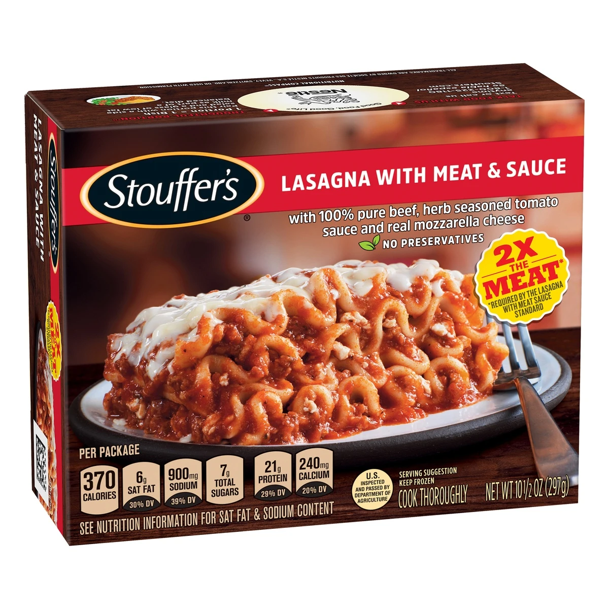 Stouffer’s Lasagna with Meat & Sauce Frozen Meal offers a quick, easy solution for lunch or dinner. This frozen lasagna dinner includes 100% pure beef, herb seasoned tomato sauce and real mozzarella c…