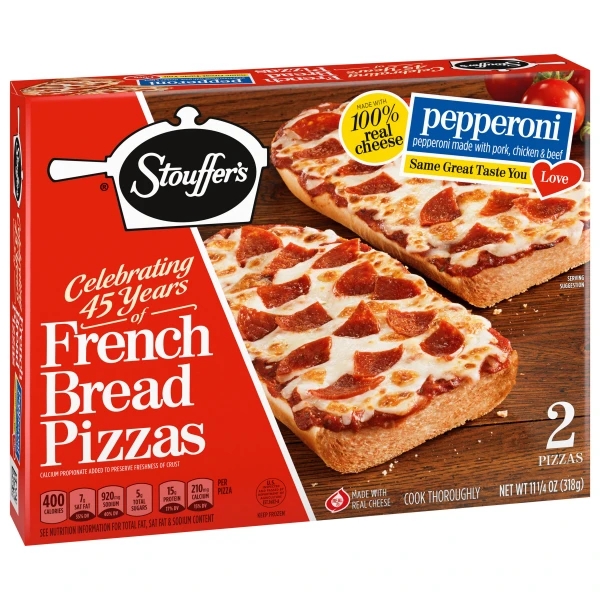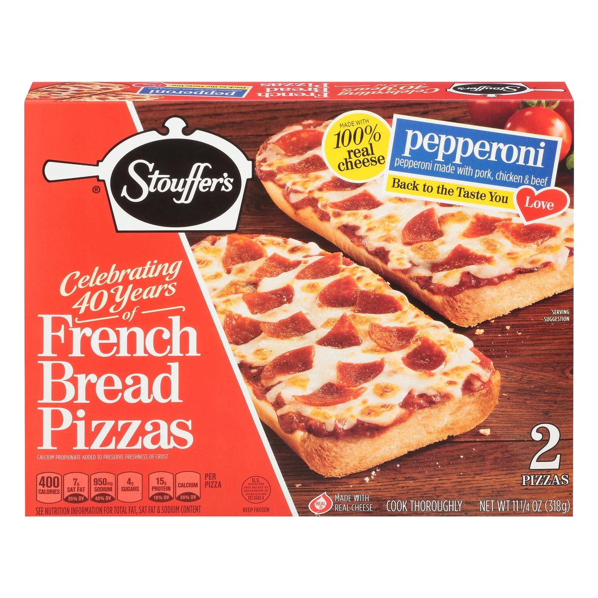 Stouffer’s Pepperoni French Bread Frozen Pizza offers a quick, easy solution for lunch or dinner. This Stouffer’s French bread pizza is made with 100% real cheese, and includes tomato sauce and zesty …